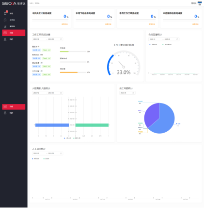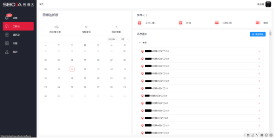 工作台主要包含:信息统计部分,日历部分(包含任务,日志,工单等),信息快捷入口(信息统计,功能快捷入口)。根据点击的不同日期可以查看不同日期的历史记录信息。
