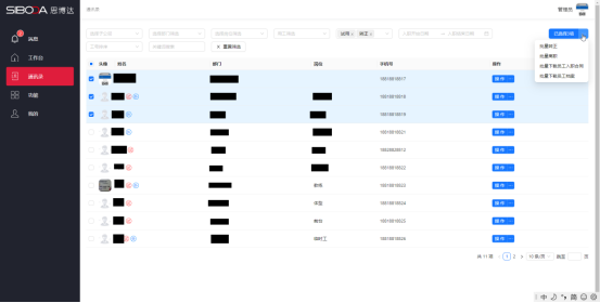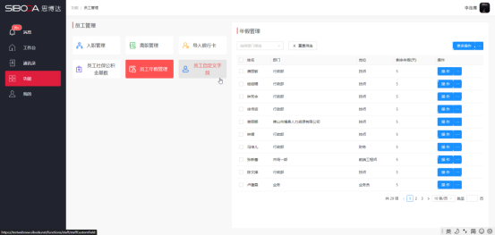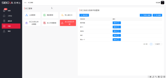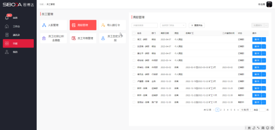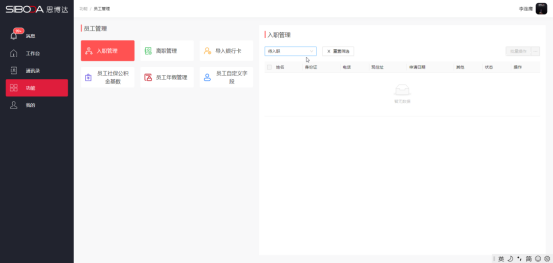 员工管理,包含员工入/离职与信息补充等设置,暂时有六大功能板块:入职管理,离职管理,导入银行卡,员工社保公积金基数,员工假期管理,员工自定义字段为此版本更新拓展功能,增加了员工除基础信息外拓展信息功能。
