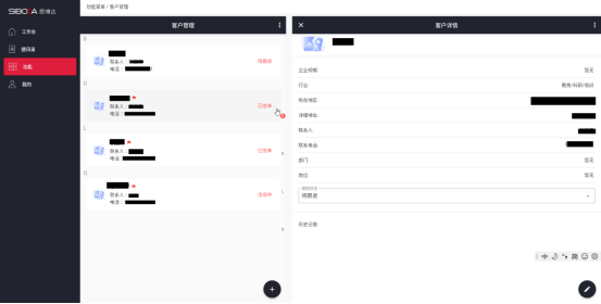客户管理功能,能够管理企业的客户信息,并进行标记记录不同类型的客户,而且可以跟我们的外出进行挂钩,后期可以进行客户成功率,访问效率等一些企业管理形式进行挂钩。有权限管理员,可以设置一些企业自己自定的标签标识进行客户等级区分,此版本新增客户指派功能,设置了权限的人员可以进行客户调整指派。