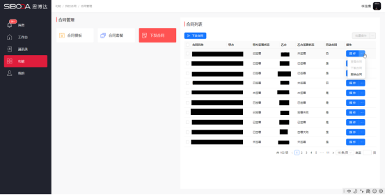 用户可以通过合同管理进行自己的电子合同模板定制和套餐定制,还可以通过合同管理进行对应员工的合同下发电子,用户通过合同列表可以查看到自己企业下发过来的合同信息