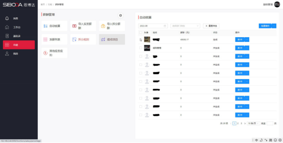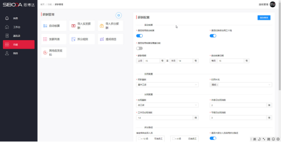 薪资管理主要包含自动核算,工资拆分,提成数据,补助与扣罚,结合整块薪资由计算到核算,再到发放到员工手上一条龙服务。